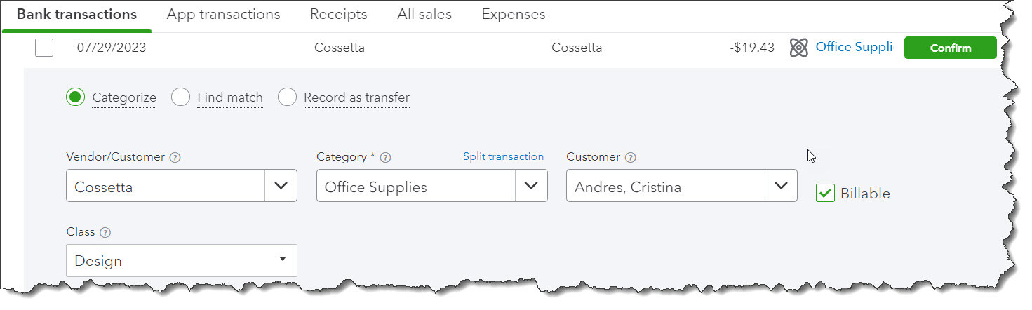 There’s one more field here that’s very important. If you’re purchased something on behalf of a customer, be sure to select the correct one from the drop-down list under the Customer field and click the Billable box. QuickBooks Online will make this transaction information available to you the next time you invoice the customer. Other fields not shown in the above image are optional, like Tags, Memo, and Add attachment. When your transaction is complete, click Confirm to move it to the Categorized list.
