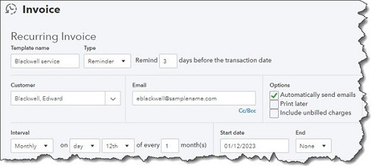 • Reminder. QuickBooks Online will send you a reminder ahead of the scheduled date. You can specify how many days ahead you should receive it. Then it’s up to you to make any necessary changes and send it out.